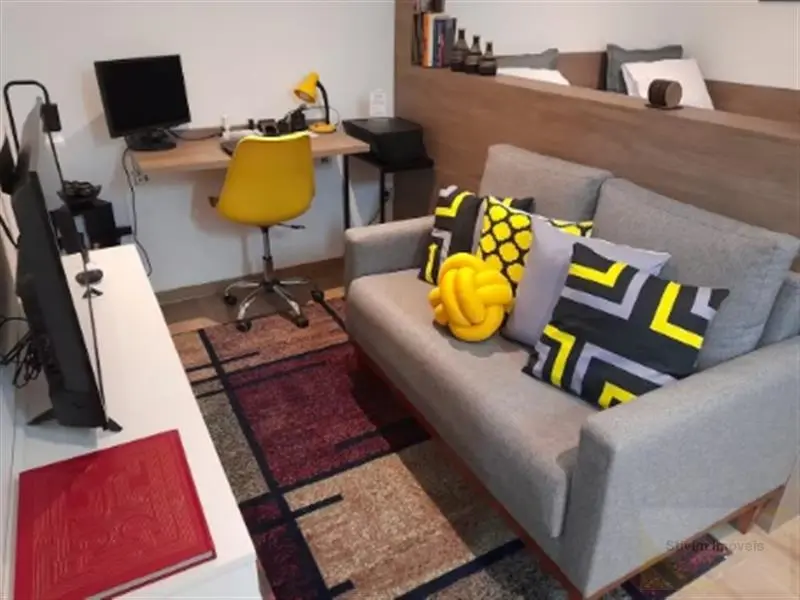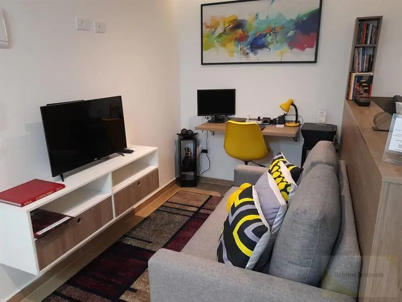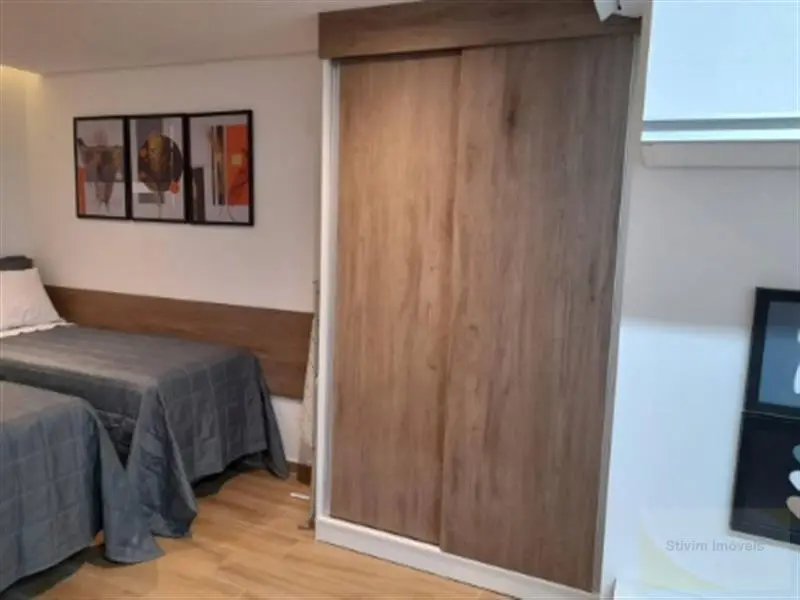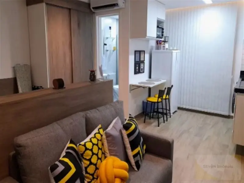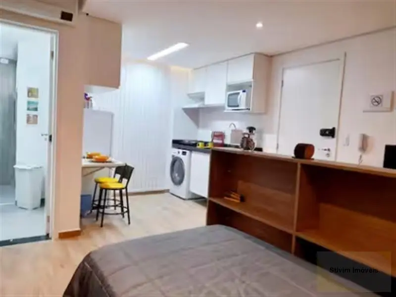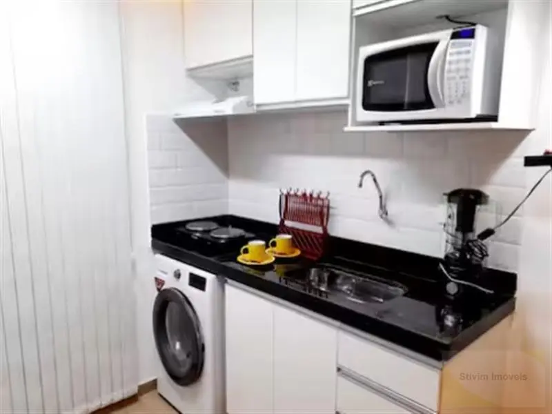 Studio todo mobiliado com armários embutidos, eletrodomésticos, geladeira, sofá, cama e máquina de lavar.