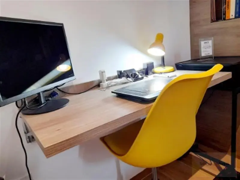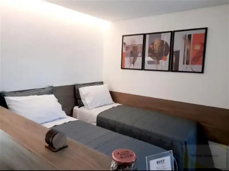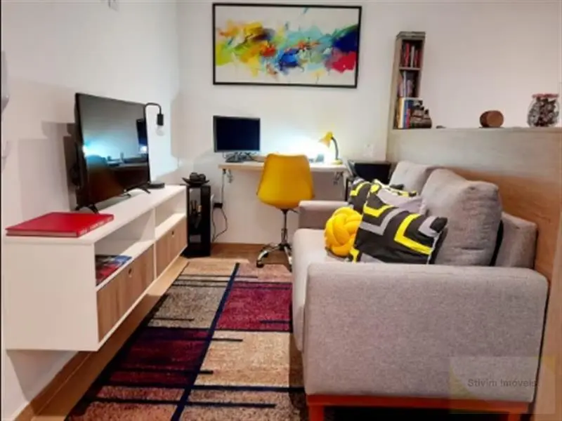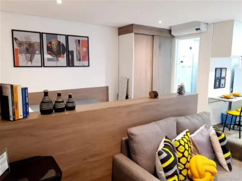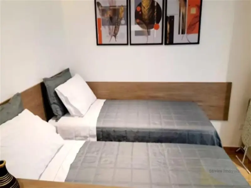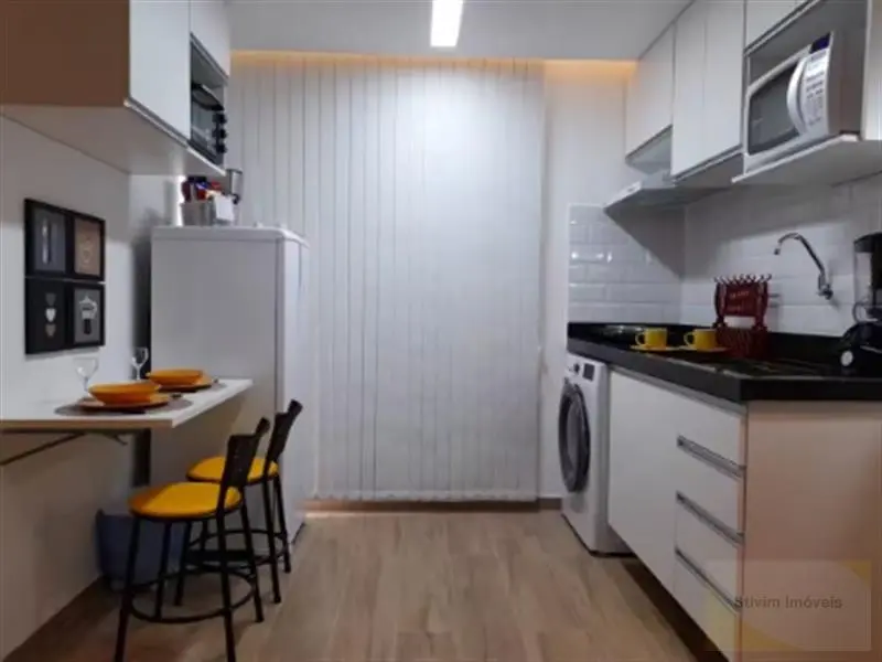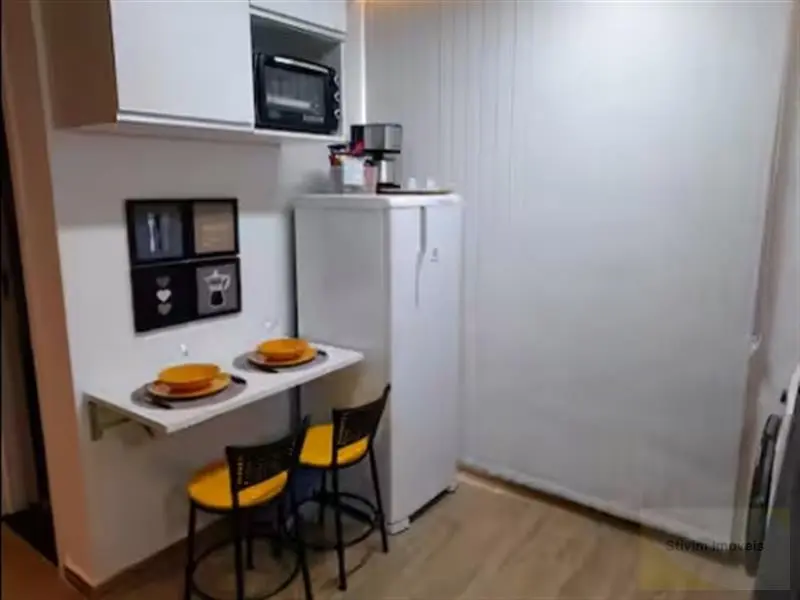 Studio todo mobiliado com armários embutidos, eletrodomésticos, geladeira, sofá, cama e máquina de lavar.