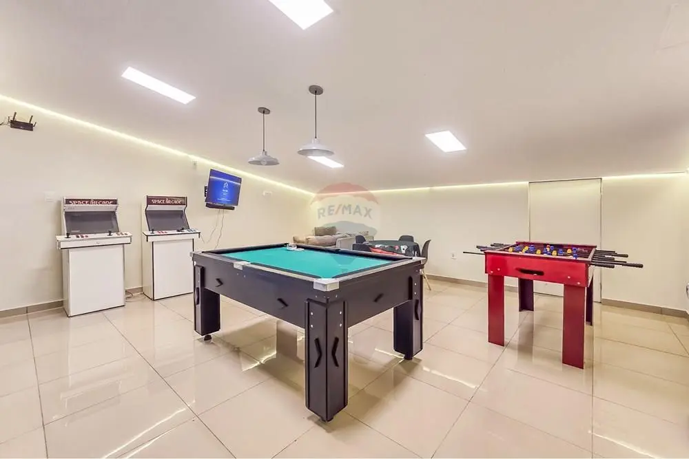 Salão de festas e salão de jogos.