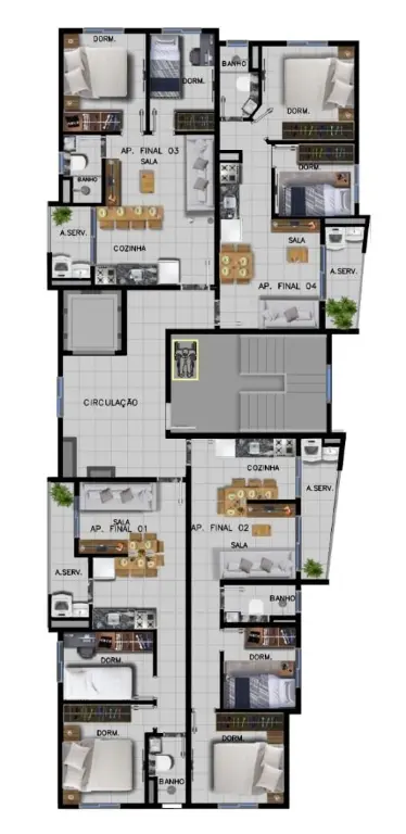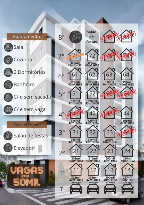 2 dormitórios, sala, cozinha, banheiro, área de serviço, opções: com ou sem sacada, com ou sem vagas, HIS 1 e HIS 2.