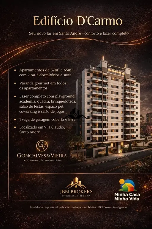 Apartamento à venda em Santo André - 3 dormitórios com suíte | D'Carmo Residencial | MCMV | Entrega Julho 2026 Se você busca um apartamento moderno, bem localizado e com condições facilitadas, o D'Carmo Residencial no Jardim Santo Antônio, Santo André, é a oportunidade ideal para sair do aluguel e conquistar seu imóvel próprio. Sobre o apartamento: ?? 65m² bem distribuídos ?? 3 dormitórios (sendo 1 suíte) ?? 2 banheiros ?? Planta funcional e moderna ?? Ambientes confortáveis e bem iluminados Ideal para quem busca praticidade no dia a dia sem abrir mão do conforto. Infraestrutura do condomínio: ?? Playground ?? Quadra poliesportiva ?? Salão de festas ?? Sala de jogos ?? Portaria 24 horas Condomínio pensado para oferecer segurança, lazer e qualidade de vida para toda a família. Localização estratégica - Jardim Santo Antônio | Santo André More próximo de tudo que você precisa: Bancos Escolas Farmácias Hospitais Supermercados Padarias Praças Fácil acesso ao transporte público Diferenciais do empreendimento: ?? Enquadrado no programa Minha Casa Minha Vida ?? Condições facilitadas de pagamento ?? Excelente custo-benefício na região ?? Entrega prevista para Julho de 2026 Se você quer morar bem localizado, com lazer, segurança e pagando parcelas acessíveis, essa é a oportunidade ideal. Preencha o formulário e agende seu atendimento agora mesmo. Somos especialistas em APROVAÇÃO DE CRÉDITO! A JBN Brokers cuida de todo o processo para você conquistar seu imóvel com segurança, agilidade e as melhores condições.