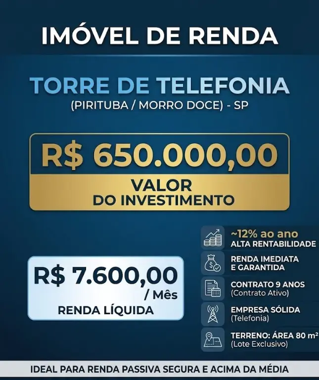 IMÓVEL DE RENDA - TORRE DE TELEFONIA » Valor: R$ 650.000,00 » Renda mensal líquida: R$ 7.600,00 » Renda anual: R$ 78.000,00 (~12% ao ano) » Localização: Morro Doce - Pirituba (SP) » Características do imóvel: Terreno: 80 m² Torre de telefonia celular já instalada Contrato ativo de 10 anos (restam 9 anos) Empresa sólida de telefonia » Vantagens do investimento: Renda imediata e garantida Baixo risco de vacância Renda passiva acima da média do mercado » Excelente oportunidade para investidores que buscam rentabilidade segura em Pirituba. Entre em contato para mais informações!