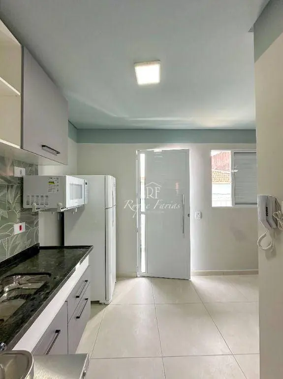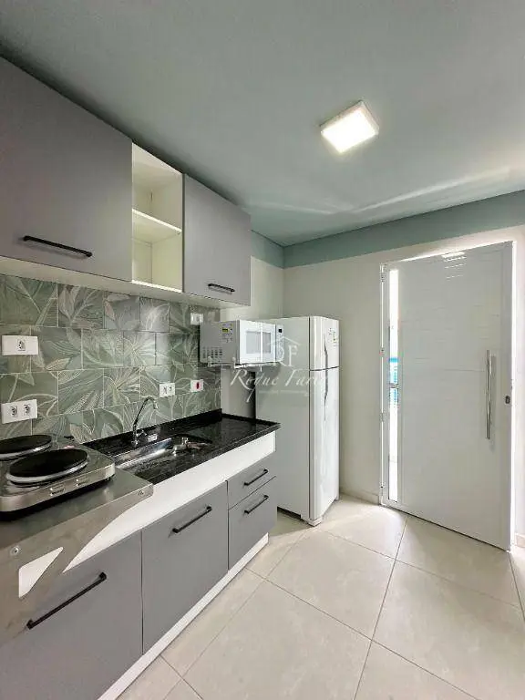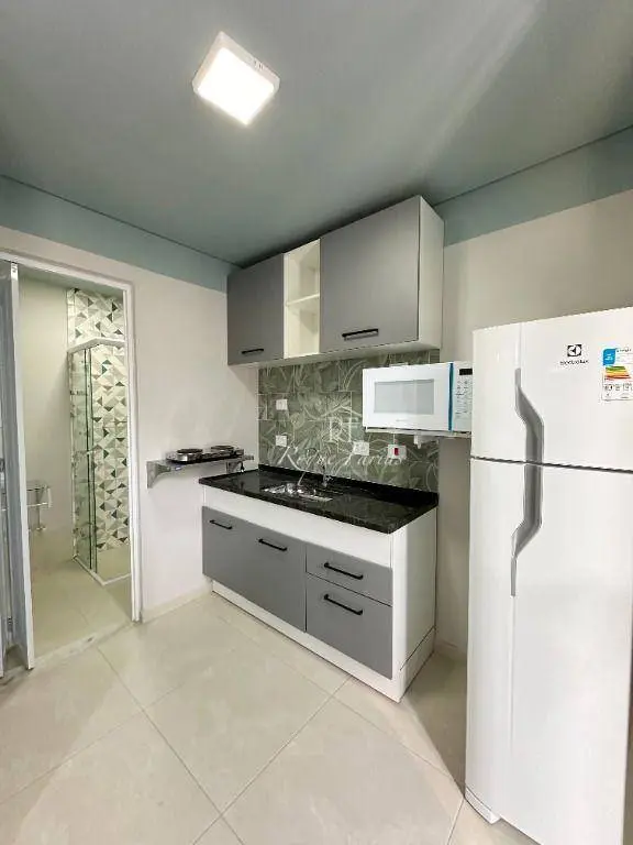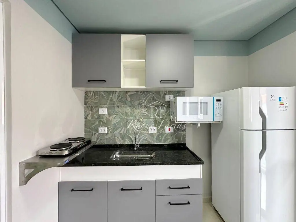 A cozinha compacta está totalmente equipada com eletrodomésticos essenciais, como fogão duas bocas, geladeira e muito mais.