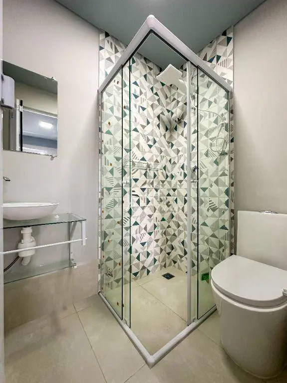 O banheiro é moderno bem iluminado, conta pia e espaço para guardar seus pertences.