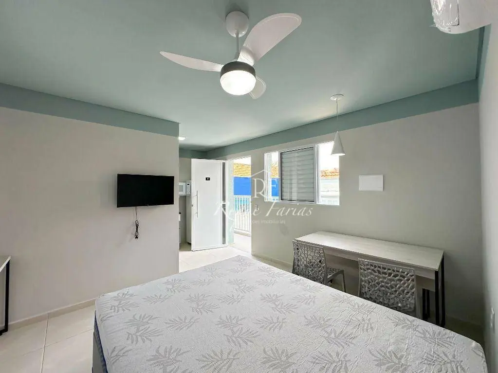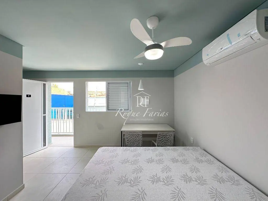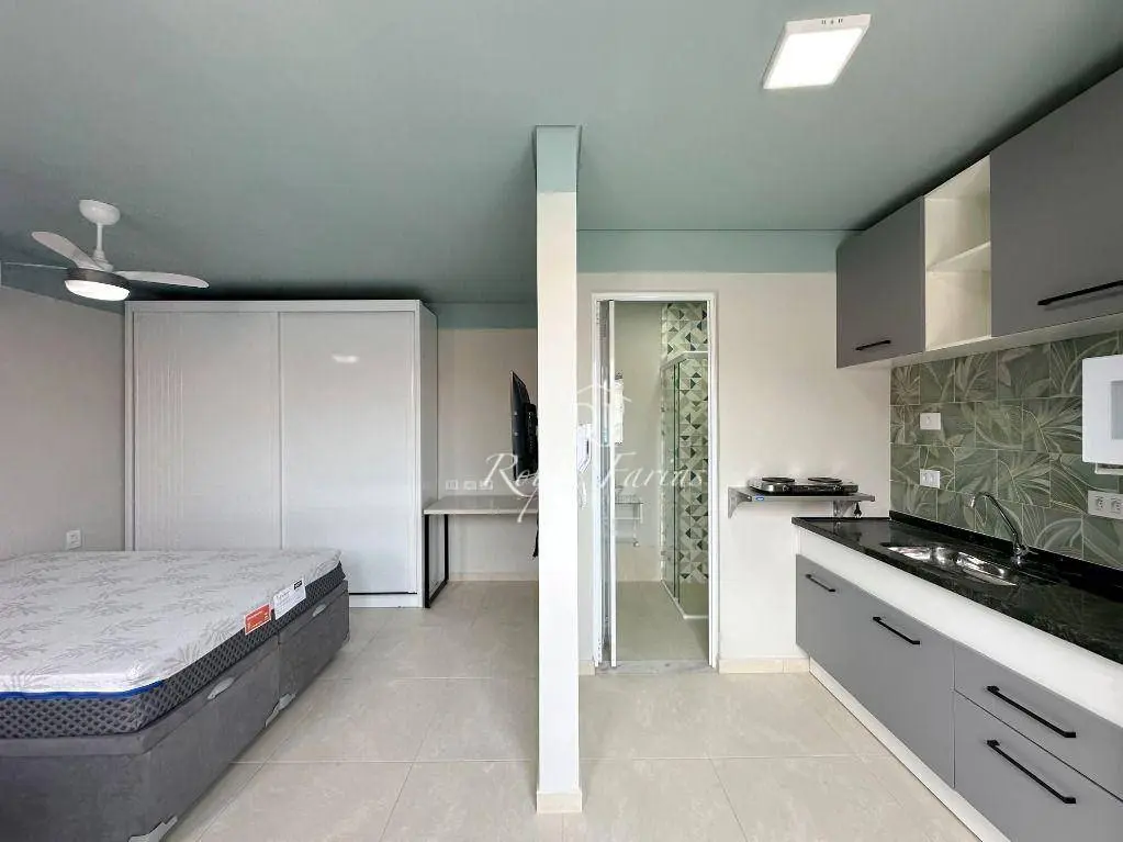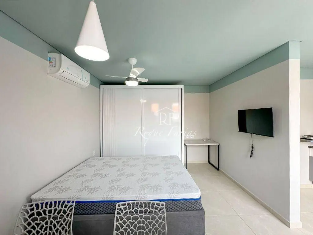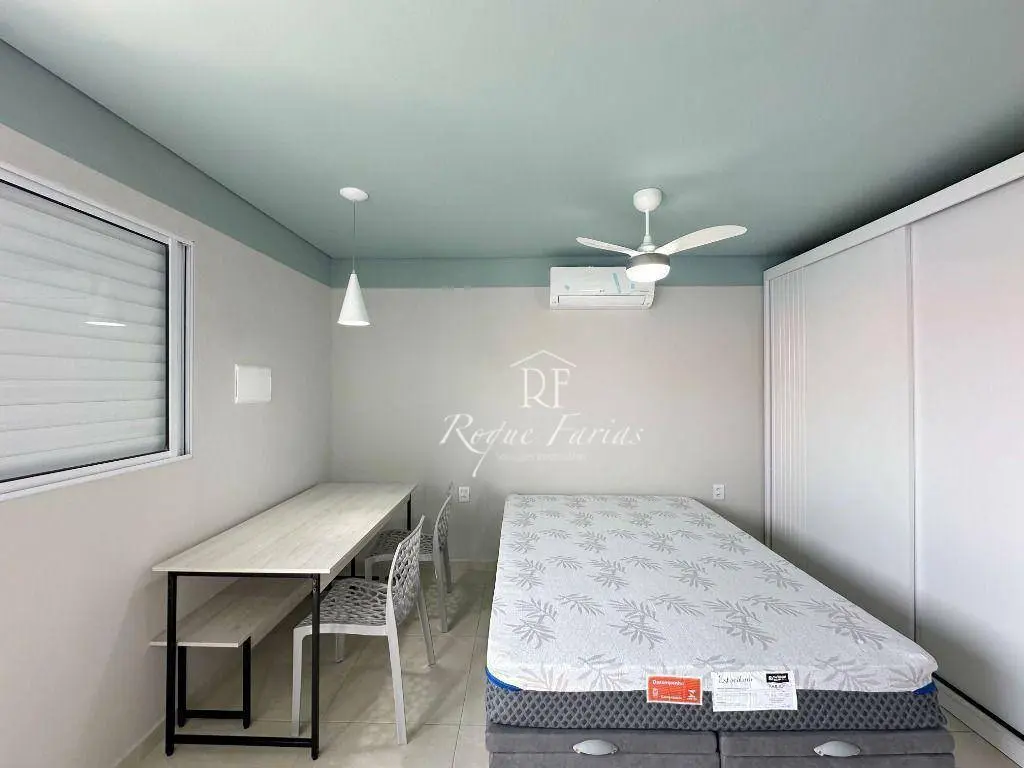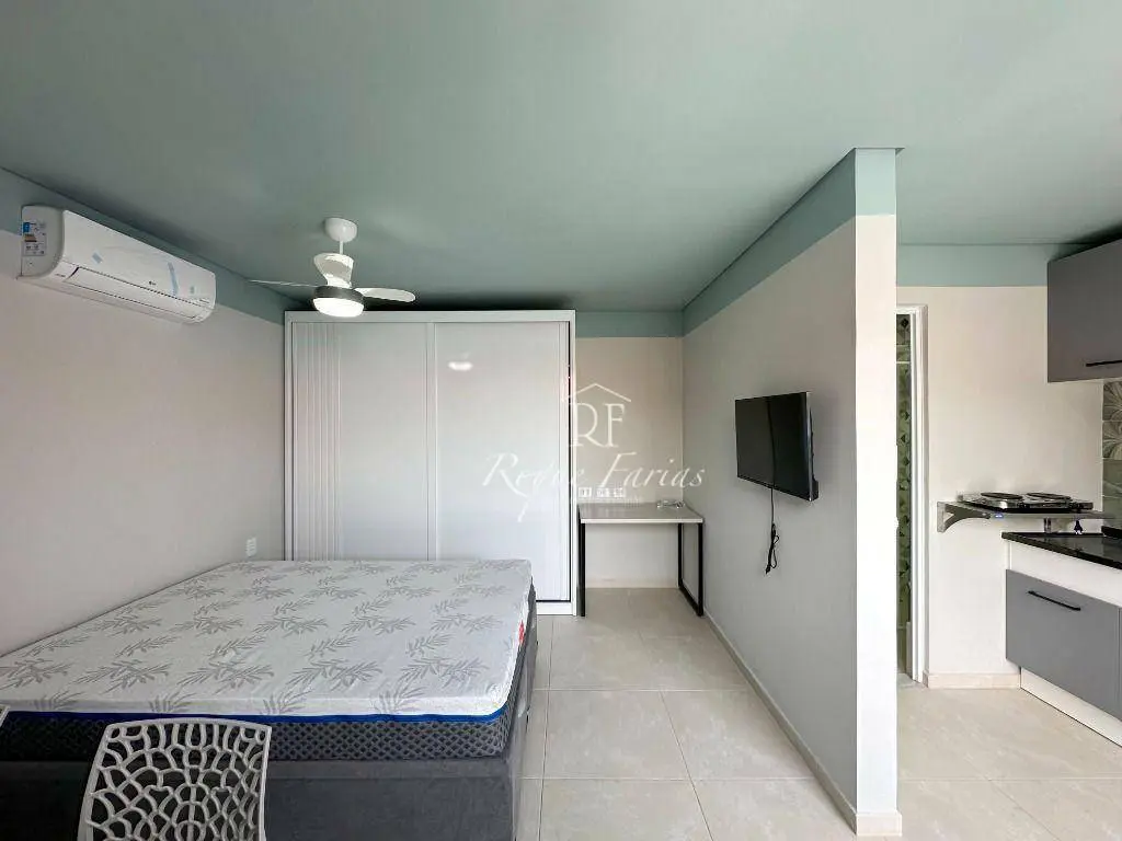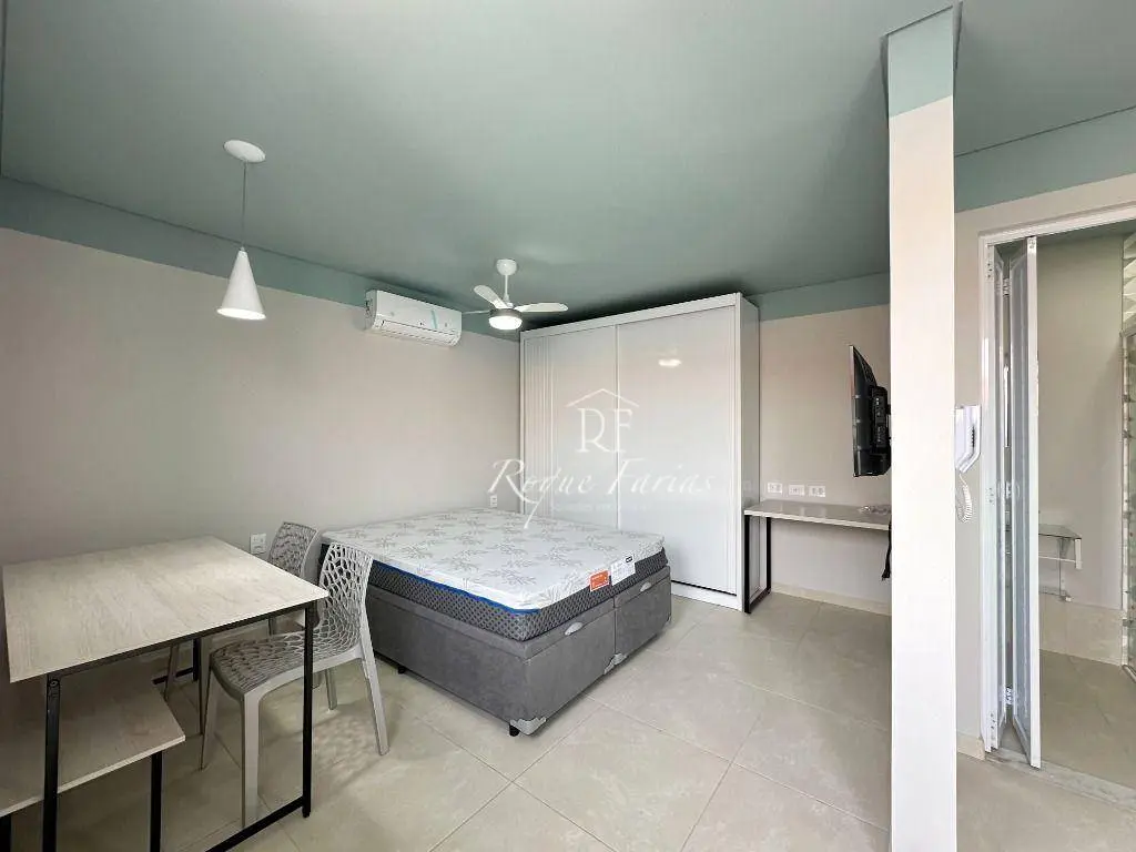 A área de estar e dormir é integrada, com piso laminado e ar condicionado que proporciona muito conforto. A paredes pintadas em tons neutros, criando uma atmosfera acolhedora e convidativa.