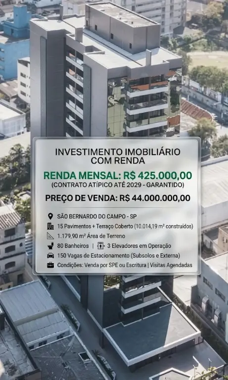 PRÉDIO À VENDA - COM RENDA ATIVA » Valor: R$ 48.500.000,00 » Renda mensal: R$ 425.000,00 (imóvel já alugado) » Localização: São Bernardo do Campo - SP » Características do imóvel: 10.014,19 m² de área construída 1.179,90 m² de área de terreno 15 andares (pavimentos iguais) + Terraço coberto 3 subsolos 80 banheiros 3 elevadores em operação 150 vagas de estacionamento (incluindo subsolos e área externa) » Detalhes da locação (Contrato Atípico): Vigência: Início em 2019, vencimento em 2029 (renovação para +10 anos) Garantia: Fiança (aviso prévio de 9 meses para desocupação) » Condições de venda: Escritura do imóvel ou SPE » Excelente oportunidade de investimento com alta rentabilidade garantida até 2029. Agende sua visita!