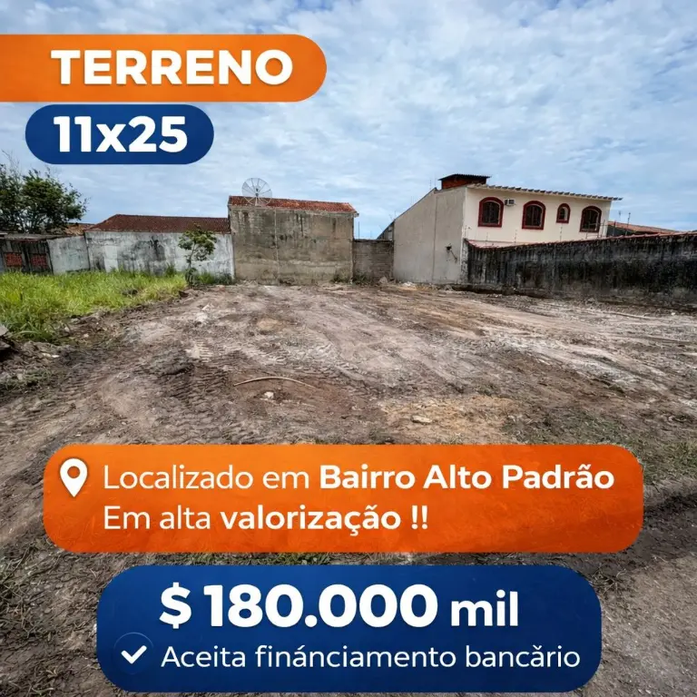 Terreno Murado e ja com Terraplanagem. Sao 275 metros 11x25. Bairro em Alta valorização alto padrão com otima infra estrutura . Terreno plano, otimo para construçao de imovel para moradia ou casas para locaçao de termporada. A poucos minutos da Praia muito bem localizado . Aceita financiamento bancario estuda veiculo como parte de pagamento .